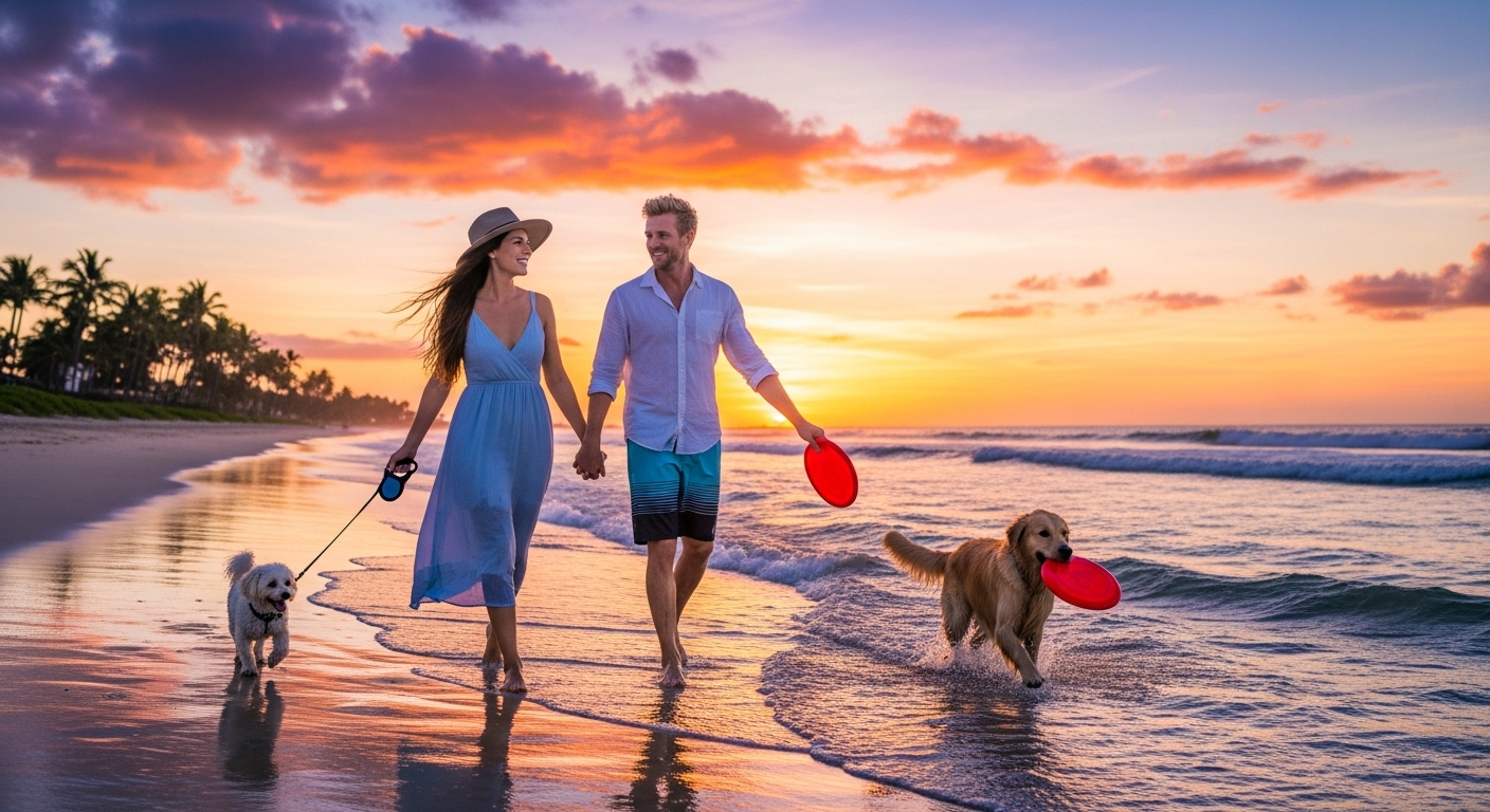 - 아침|해변 보더라인 산책 – 이른 시간 파도 소리에 적응시키며 짧은 리드로 이동. 해변 모래 섭취 주의.